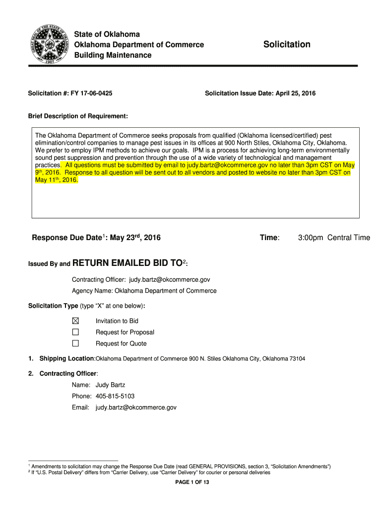 Building MaintenanceSolicitation #: FY 17060425SolicitationSolicitation Issue Date: April 25, 2016Brief Description of Requirement: