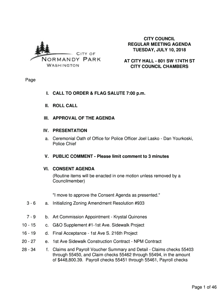 CITY COUNCIL REGULAR MEETING AGENDA TUESDAY, JULY 10, 2018, AT CITY HALL 801 SW 174TH ST CITY COUNCIL CHAMBERS Page I. CALL TO ORDER & FLAG SALUTE 7:00 p.m. .II. ROLL CALL .III. APPROVAL OF THE AGENDA.IV.