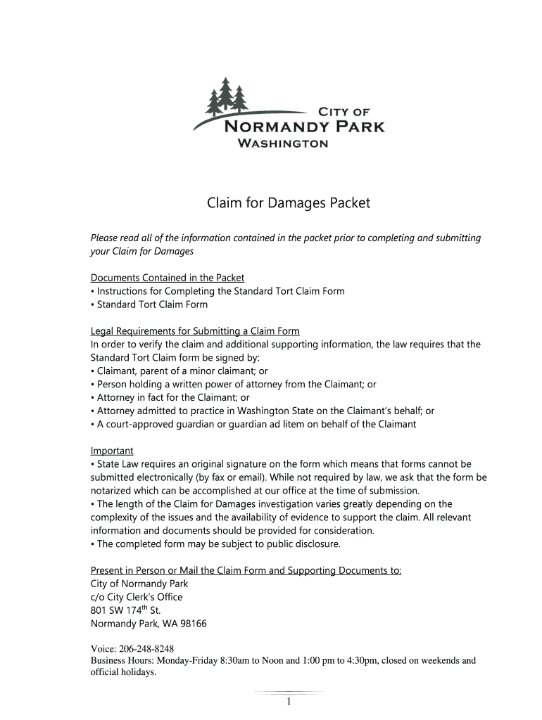 Claim for Damages Packet Please read all the information contained in the packet prior to completing and submitting your Claim for Damages Documents Contained in the Packet Instructions for Completing