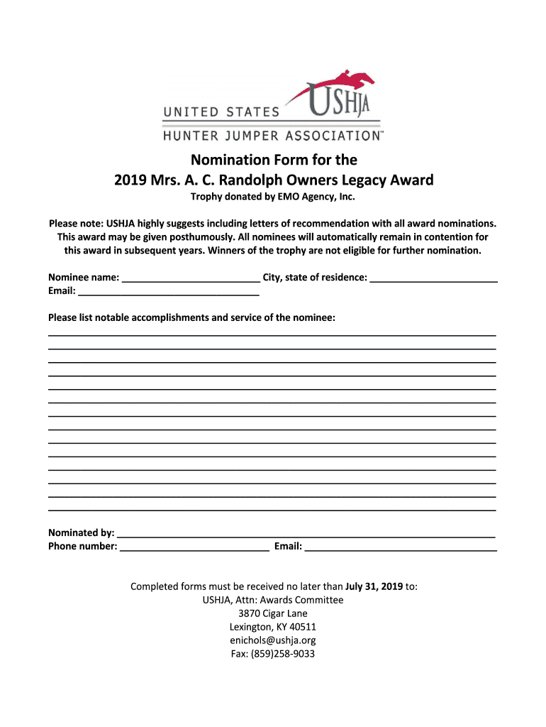 Get the free Nomination Form for the 2019 Mrs. AC Randolph Owners ... - USHJA