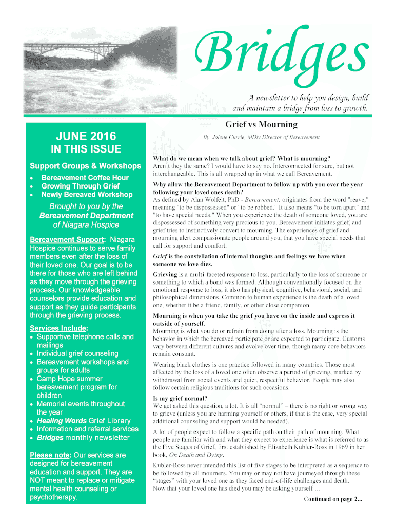 Bridges A newsletter to help you design, build and maintain a bridge from loss to growth. JUNE 2016IN THIS ISSUE Support Groups & Workshops Bereavement Coffee Hour Growing Through Grief Newly Bereaved