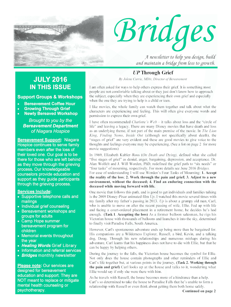 Bridges A newsletter to help you design, build and maintain a bridge from loss to growth. JULY 2016IN THIS ISSUE Support Groups & Workshops Bereavement Coffee Hour Growing Through Grief Newly Bereaved