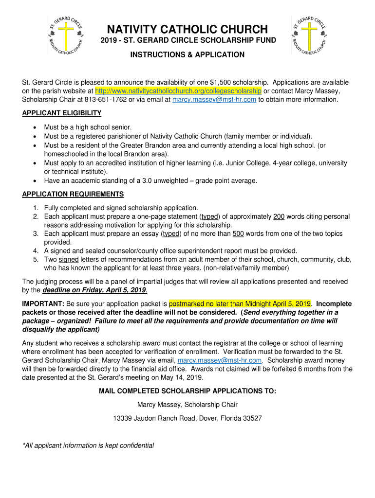 NATIVITY CATHOLIC CHURCH 2019 ST. GERARD CIRCLE SCHOLARSHIP FUND INSTRUCTIONS & Applications. Gerard Circle is pleased to announce the availability of one $1,500 scholarship. Applications are available