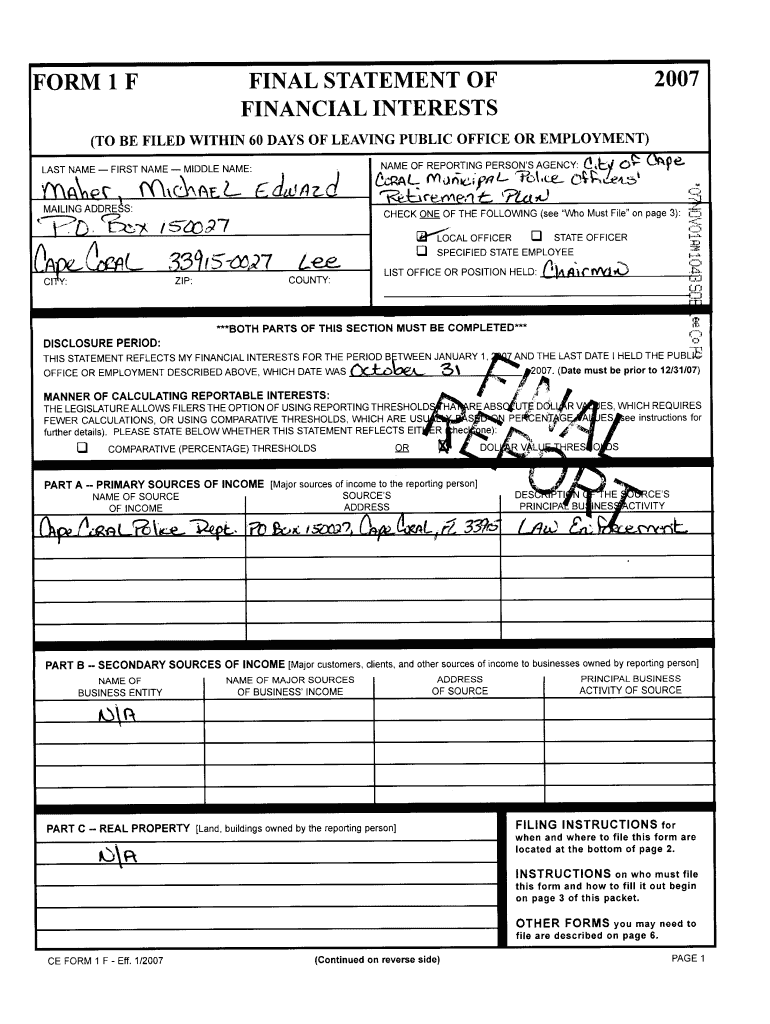 FORM 1 F FINAL STATEMENT OF 2007 FINANCIAL INTERESTS (TO BE FILED WITHIN 60 DAYS OF LEAVING PUBLIC OFFICE OR EMPLOYMENT) NAME OF REPORTING PERSON IS AGENCY:LAST NAME FIRST NAME MIDDLE NAME:RAAF Lr