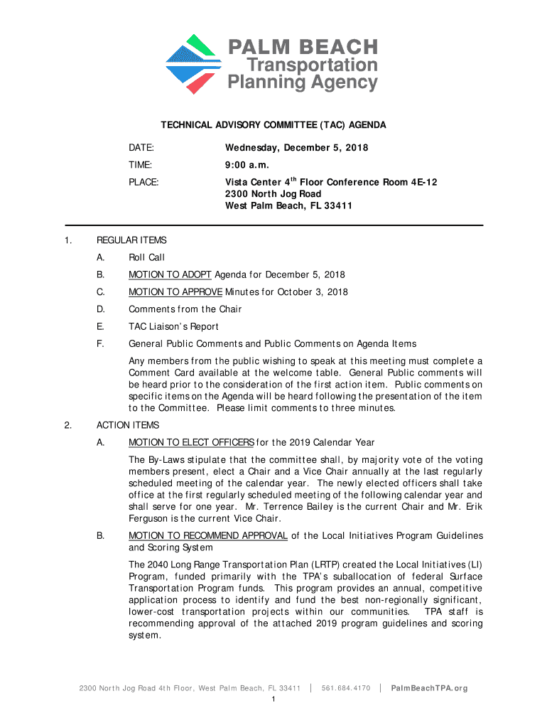 TECHNICAL ADVISORY COMMITTEE (TAC) AGENDA1.DATE:Wednesday, December 5, 2018TIME:9:00 a.m.PLACE:Vista Center 4th Floor Conference Room 4E12