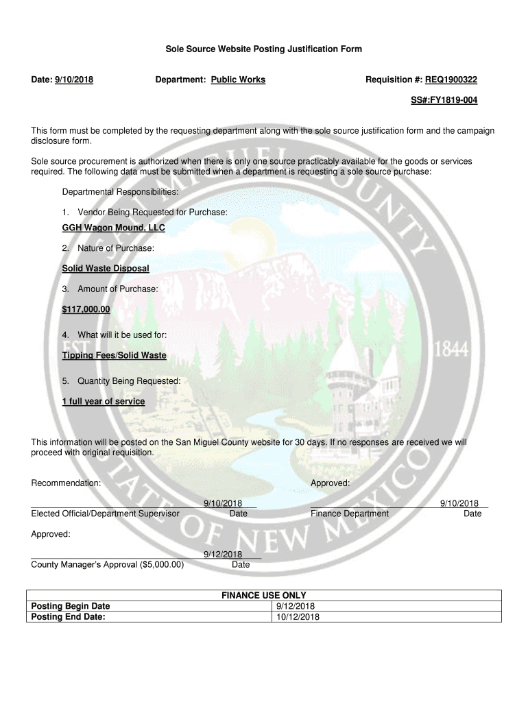SS#:FY1819004This form must be completed by the requesting department along with the sole