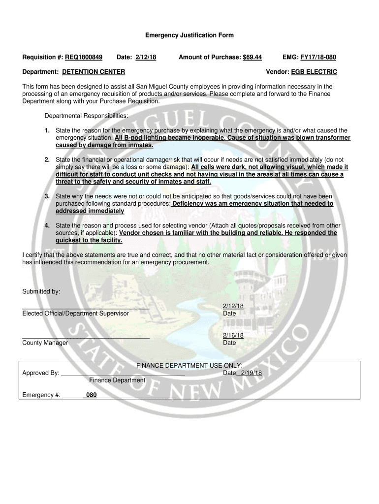 Get the free Emergency Justification Form Requisition #: REQ1800849 Date ...