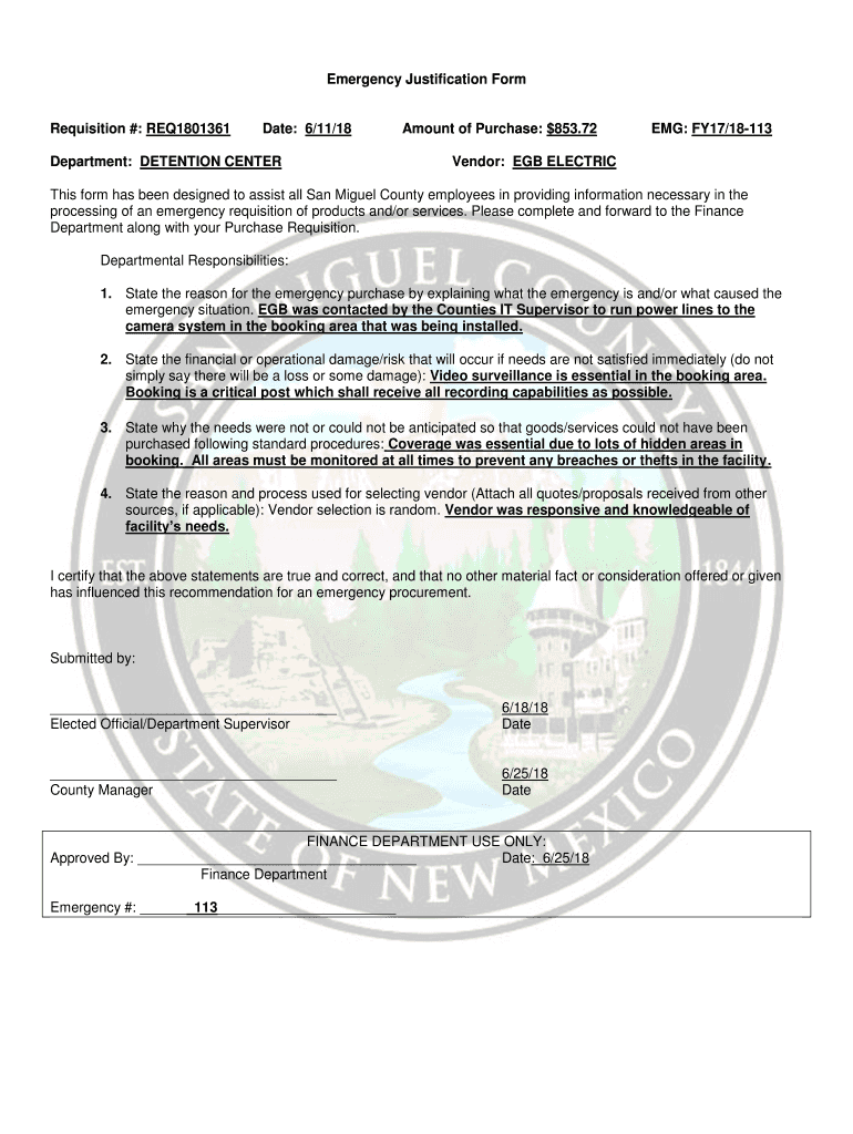 Get the free Emergency Justification Form Requisition #: REQ1801361 Date ...