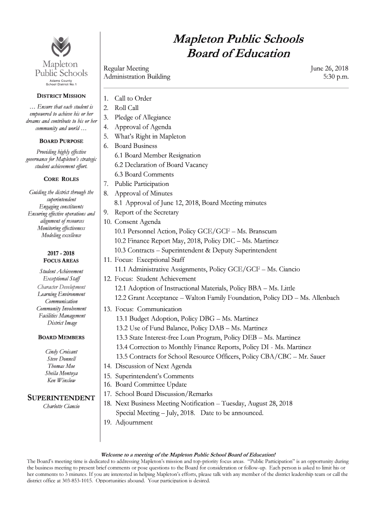Mapleton Public Schools Board of Education Regular Meeting Administration Building DISTRICT MISSION Ensure that each student is empowered to achieve his or her dreams and contribute to his or her