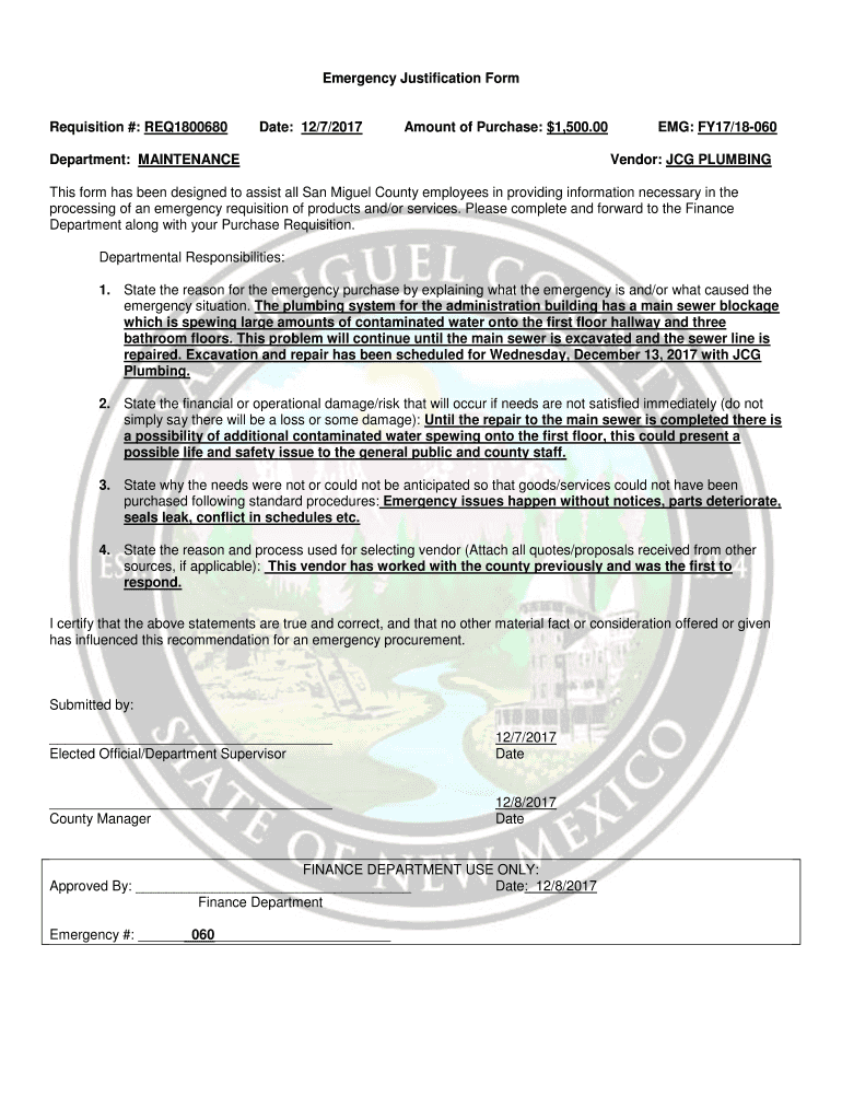 Get the free Emergency Justification Form Requisition #: REQ1800680 Date ...