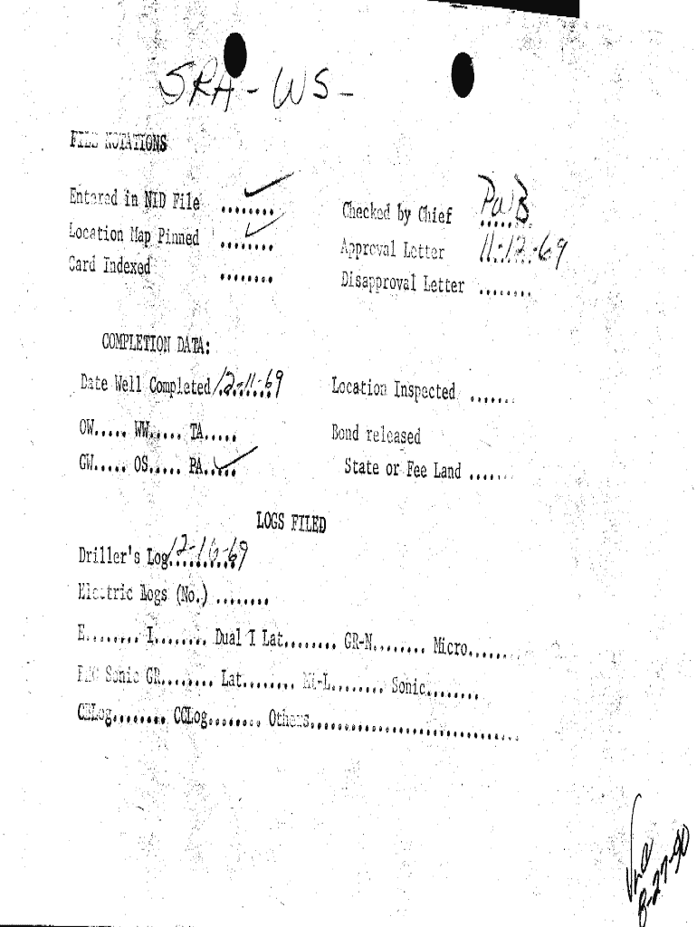 Entered in NID FileLocationHap PinnedCardChecked........ Indexed.... Approval........ DiapprovalChief LetterLetterCOMPLETIONDATA: Well ComplatedDateLocationOW..... W.....TA....GW.....OS.....PA. Inspected