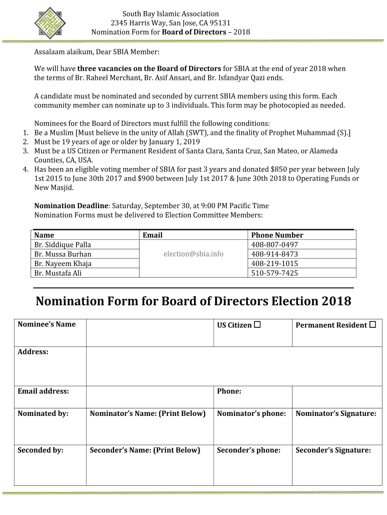 South Bay Islamic Association 2345 Harris Way, San Jose, CA 95131 Nomination Form for Board of Directors 2018 Assalamu alaikum, Dear SBA Member: We will have three vacancies on the Board of Directors