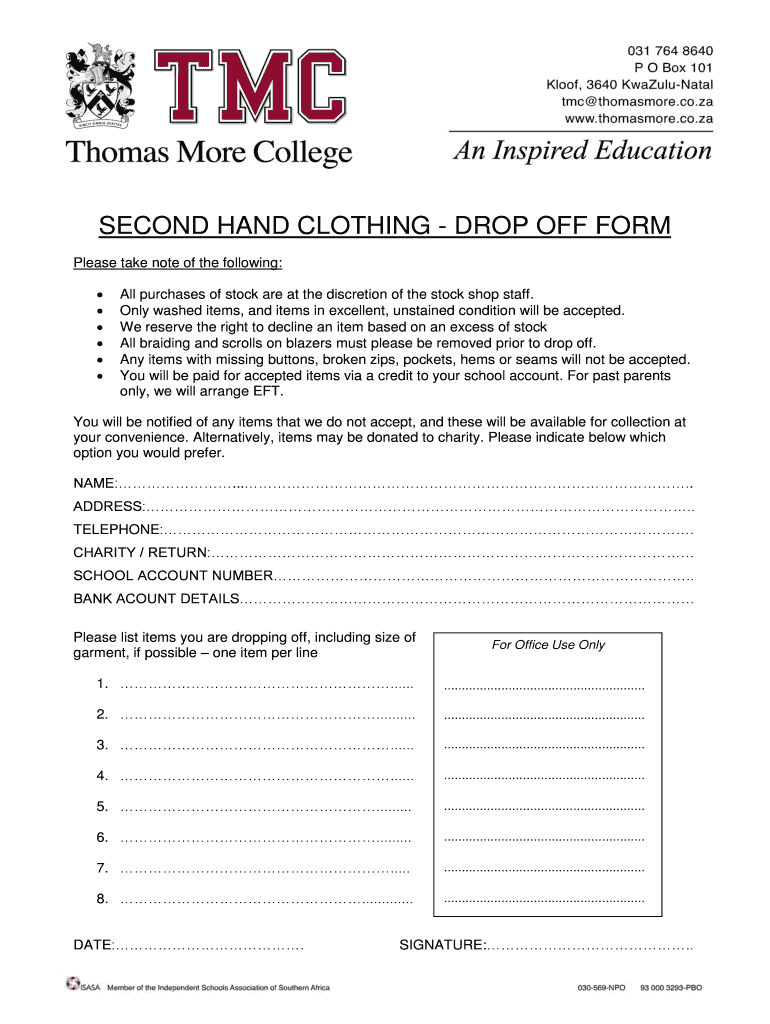 SECOND HAND CLOTHING DROP OFF FORM Please take note of the following: All purchases of stock are at the discretion of the stock shop staff. Only washed items, and items in excellent, unstained condition