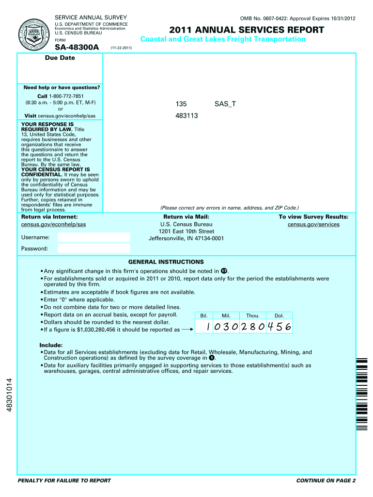 OMB No. 06070422: Approval Expires 10/31/2012SERVICE ANNUAL SURVEY U.S. DEPARTMENT OF COMMERCE2011 ANNUAL SERVICES REPORTEconomics and Statistics Administration. S. CENSUS BUREAUCoastal and Great