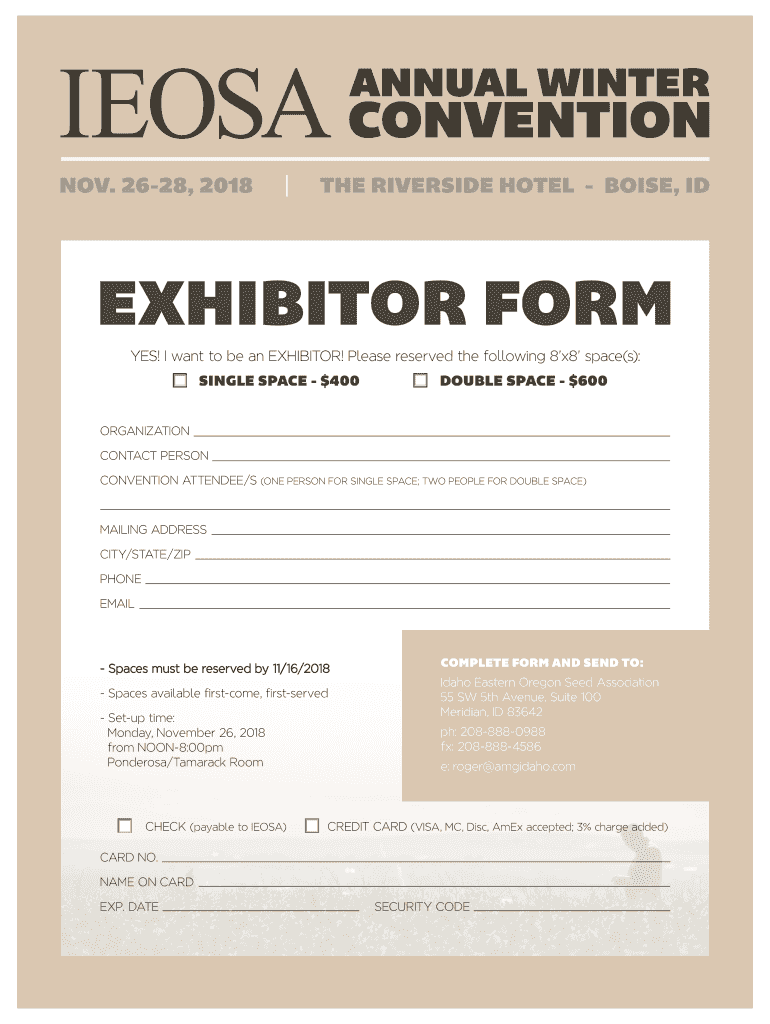 YES! I want to be an EXHIBITOR! Please reserve the following 8 'x8 space(s): SINGLE SPACE $400DOUBLE SPACE $600ORGANIZATION CONTACT PERSON CONVENTION ATTENDEE/S(ONE PERSON FOR SINGLE SPACE; TWO PEOPLE