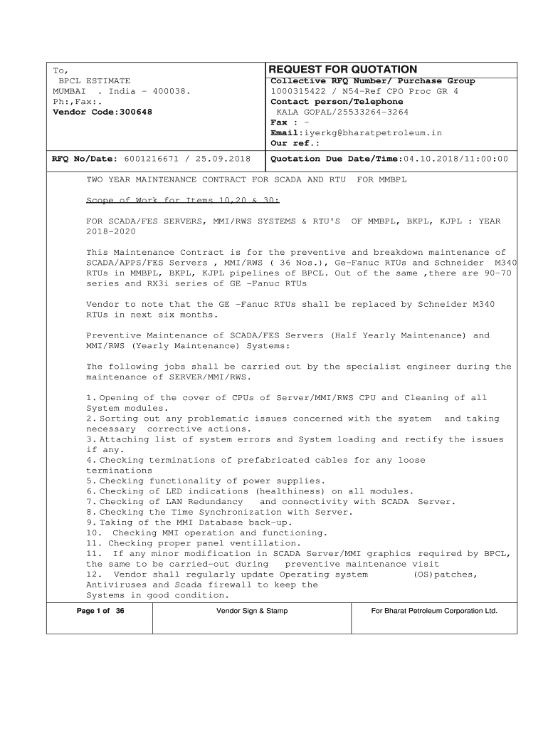 To, BCL ESTIMATE MUMBAI. India 400038. PH:, Fax:. Vendor Code:300648REQUEST FOR QUOTATION No/Date: 6001216671 / 25.09.2018Quotation Due Date/Time:04.10.2018/11:00:00Collective RFQ Number/ Purchase