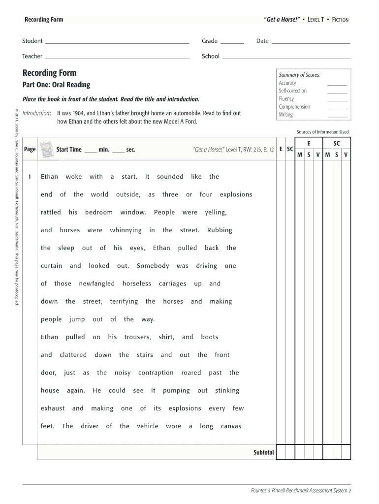This document is a reading assessment recording form used to evaluate students' oral reading abilities and comprehension of the fictional story 'Get a Horse!' which takes place in 1904 and discusses