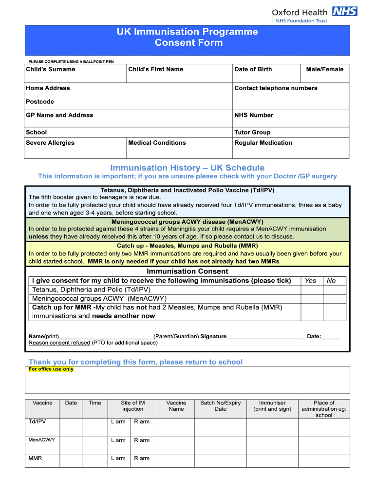 Get the free UK Immunisation Programme Consent Form - Oxford Health NHS ...