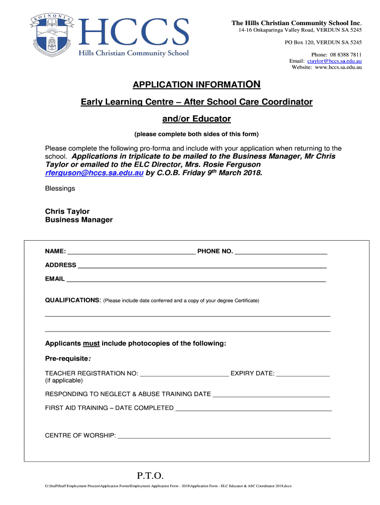 The Hills Christian Community School Inc. 1416 Onkaparinga Valley Road, VERDUN SA 5245 PO Box 120, VERDUN SA 5245 Phone: 08 8388 7811 Email: Taylor CCS.SA.edu.AU Website: www.hccs.sa.edu.auAPPLICATION