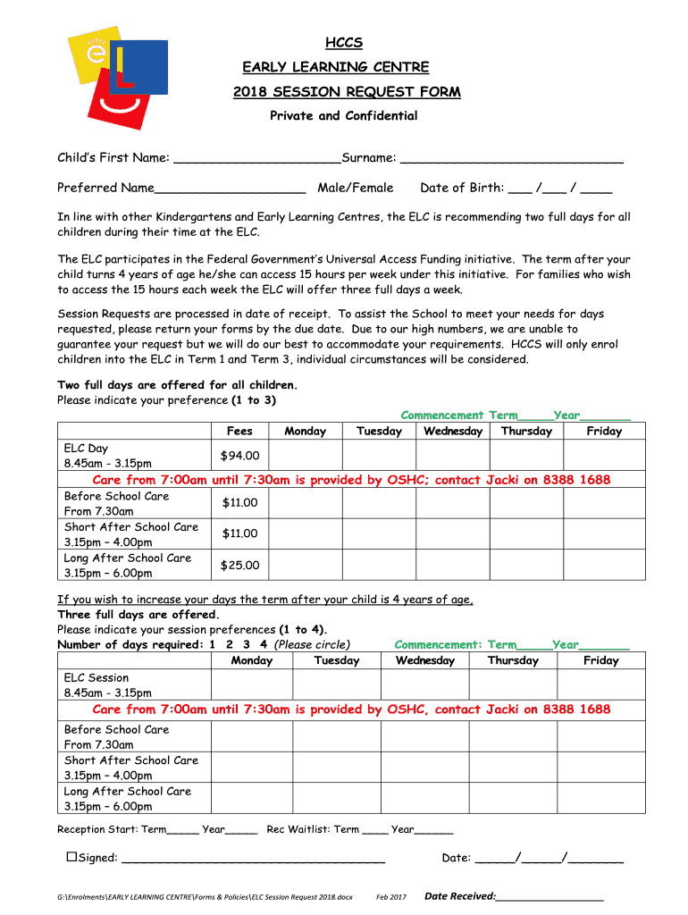 CCS EARLY LEARNING Center 2018 SESSION REQUEST FORM Private and Confidential Child's First Name: Surname: Preferred Name Male/Revalidate of Birth: / / In line with other Kindergartens and Early Learning