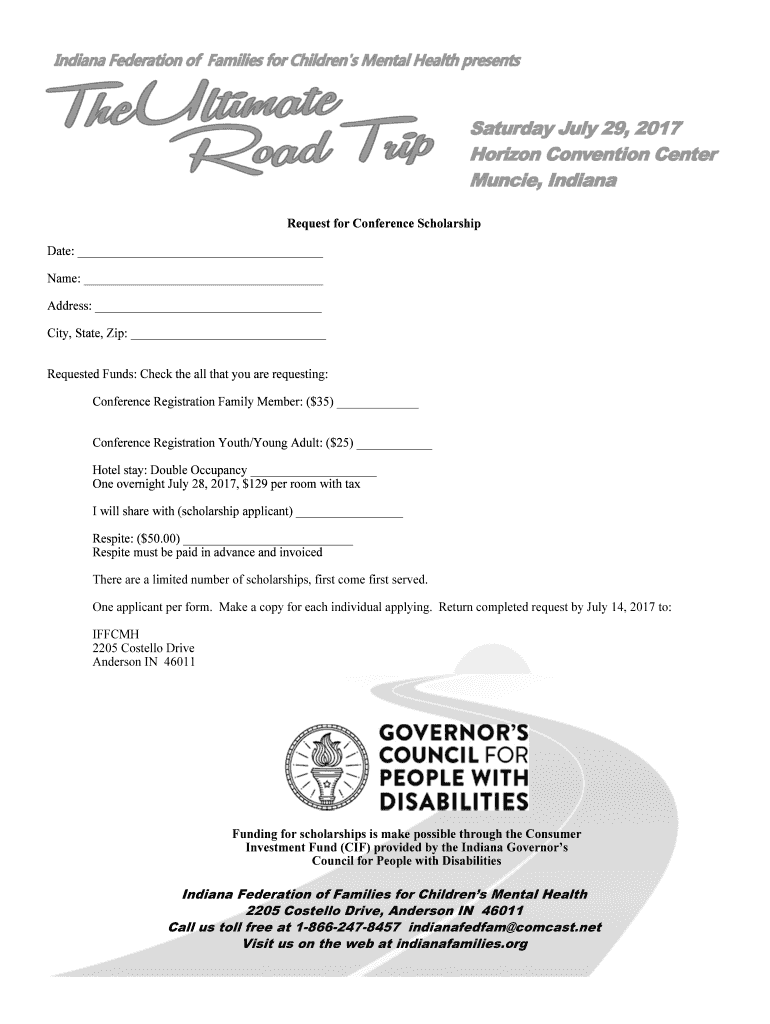 Request for Conference Scholarship Date: Name: Address: City, State, Zip: Requested Funds: Check the all that you are requesting: Conference Registration Family Member: ($35) Conference Registration