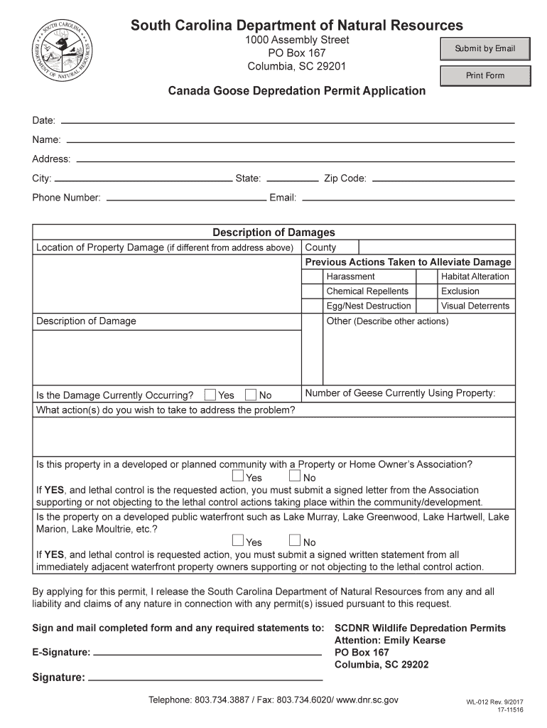 Columbia, SC 29201Submit by Emailing Form Canada Goose Depredation Permit Application