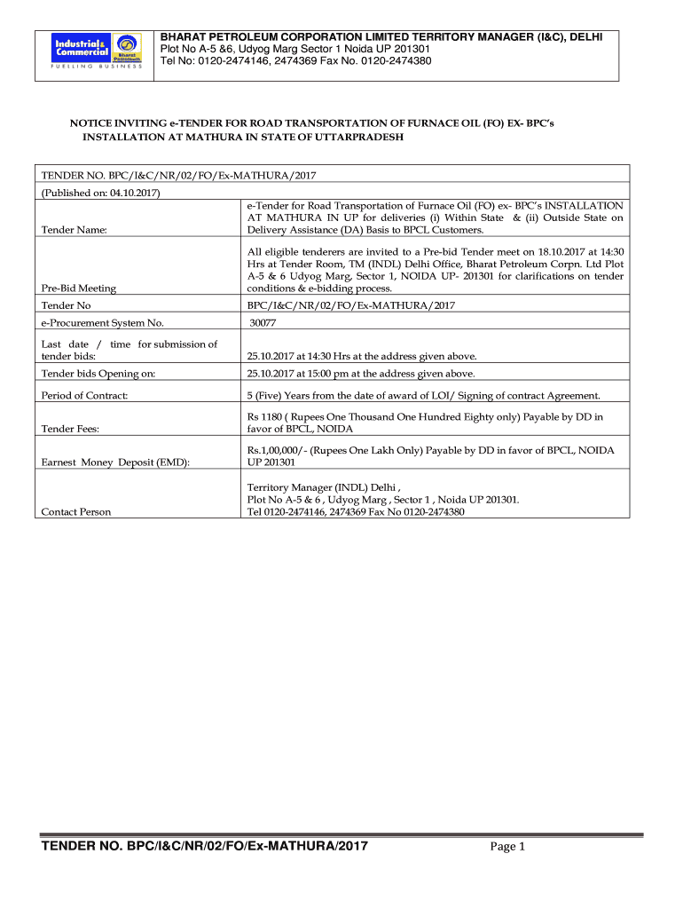 Get the free TENDER NO. BPC/I&C/NR/02/FO/Ex-MATHURA/2017
