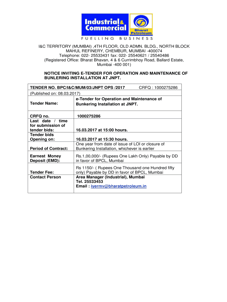 I&C TERRITORY (MUMBAI), 4TH FLOOR, OLD ADEN. BLDG., NORTH BLOCK MAUL REFINERY, CHEM BUR, MUMBAI 400074 Telephone: 022 25533431 faxes: 022 25540621 / 25540486 (Registered Office: Bharat Haven, 4 &
