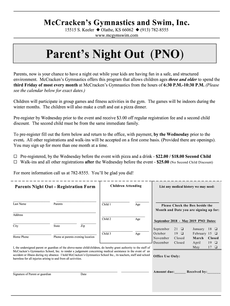 McCracken Gymnastics and Swim, Inc. 15515 S. Keeper Olathe, KS 66062 (913) 7828555 www.mcgymswim.comParents Night Out (NO) Parents, now is your chance to have a night out while your kids are having