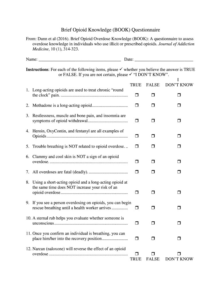Brief Opioid Knowledge (BOOK) Questionnaire From: Dunn et al. (2016). Brief Opioid Overdose Knowledge (BOOK): A questionnaire to assess overdose knowledge in individuals who use illicit or prescribed