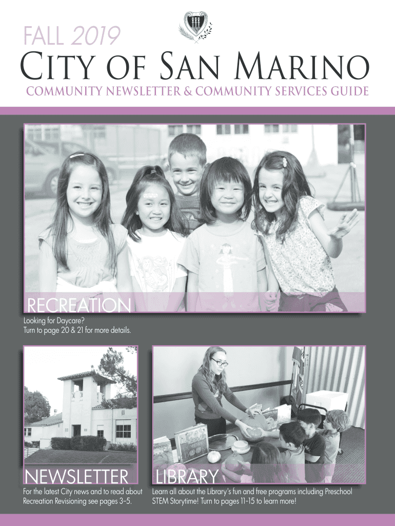 FALL 2019City of San Marino COMMUNITY NEWSLETTER & COMMUNITY SERVICES GUIDERECREATIONLooking for Daycare? Turn to page 20 & 21 for more details. Newsletter the latest City news and to read about Recreation