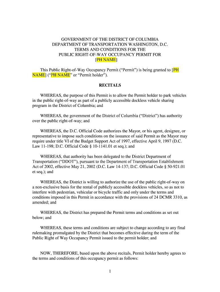 GOVERNMENT OF THE DISTRICT OF COLUMBIA DEPARTMENT OF TRANSPORTATION WASHINGTON, D.C. TERMS AND CONDITIONS FOR THE PUBLIC RIGHTOFWAY OCCUPANCY PERMIT FOR PH NAME This Public RightofWay Occupancy Permit