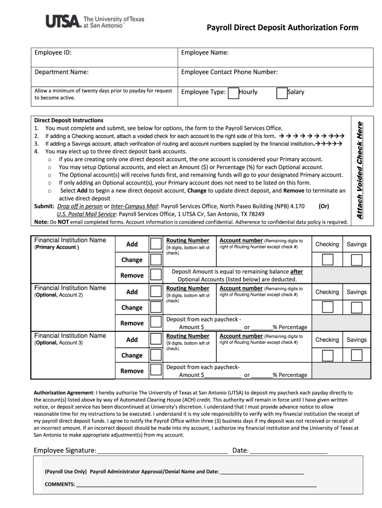 Any employee of The University of Texas at San Antonio can use this form to authorize direct deposit of their paycheck into their personal bank account.