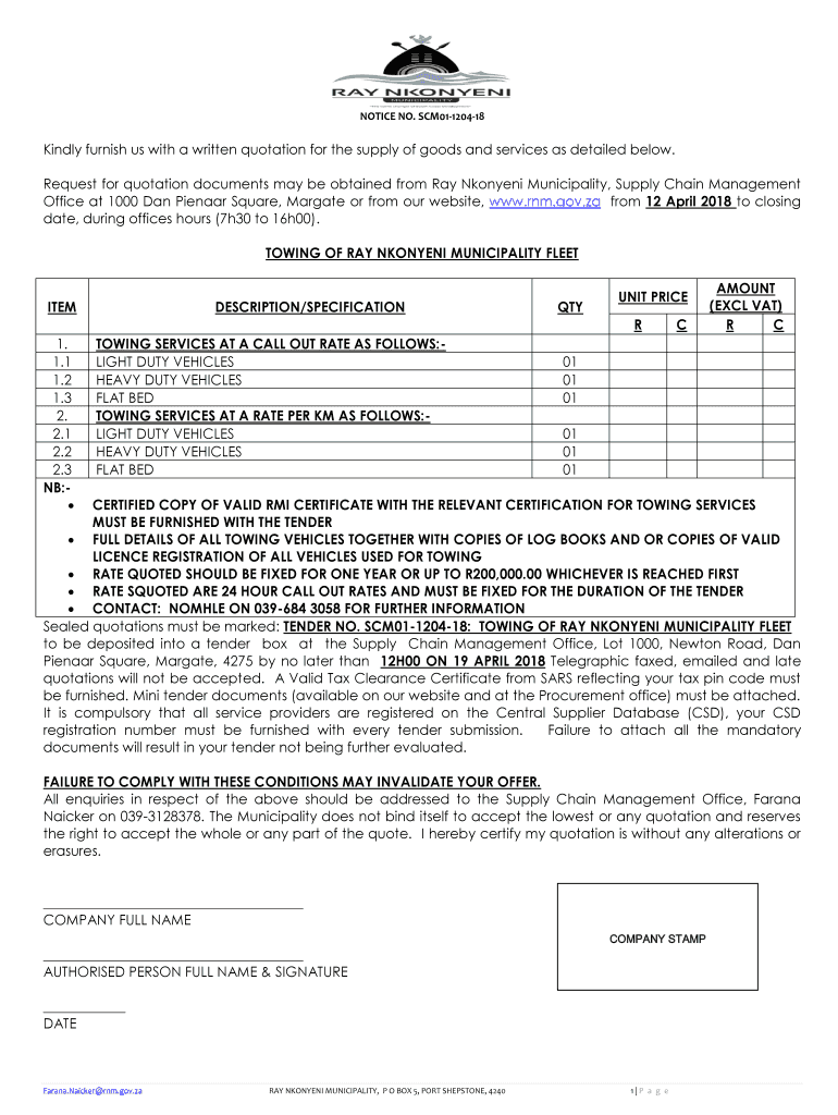 NOTICE NO. SCM01120418Kindly furnish us with a written quotation for the supply of goods and services as detailed below.