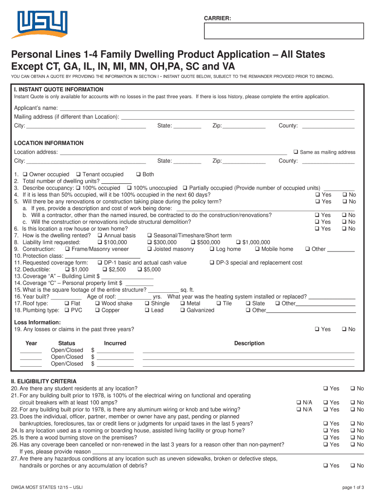 CARRIER:Personal Lines 14 Family Dwelling Product Application All States Except CT, GA, IL, IN, MI, MN, OH, PA, SC and VA YOU CAN OBTAIN A QUOTE BY PROVIDING THE INFORMATION IN SECTION I Instantly