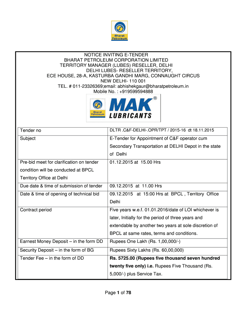 NOTICE INVITING TENDER BHARAT PETROLEUM CORPORATION LIMITED TERRITORY MANAGER (LUBES) RESELLER, DELHI LUBES RESELLER TERRITORY, ECE HOUSE, 28A, PASTURE GANDHI MARY, CAUGHT CIRCUS NEW DELHI 110 001