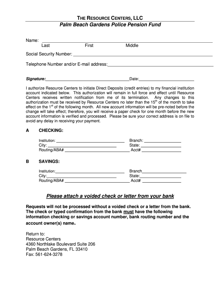 THE RESOURCE CENTERS, LLC Palm Beach Gardens Police Pension Fund Name: Last First Middle Social Security Number: Telephone Number and/or Email address: Signature:Date:I authorize Resource Centers