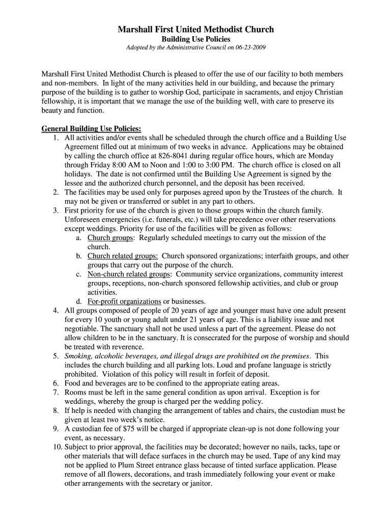 Adopted by the Administrative Council on 06232009Marshall First United Methodist Church is pleased to offer the use of our facility to