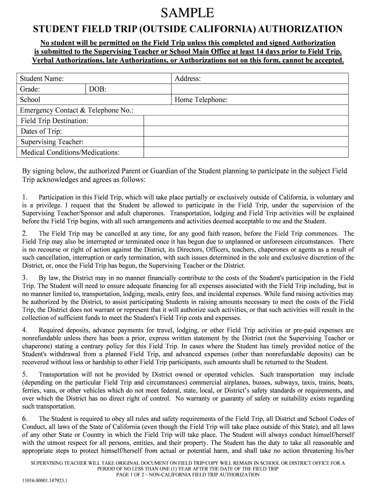 SAMPLE STUDENT FIELD TRIP (OUTSIDE CALIFORNIA) AUTHORIZATION No student will be permitted on the Field Trip unless this completed and signed Authorization is submitted to the Supervising Teacher or