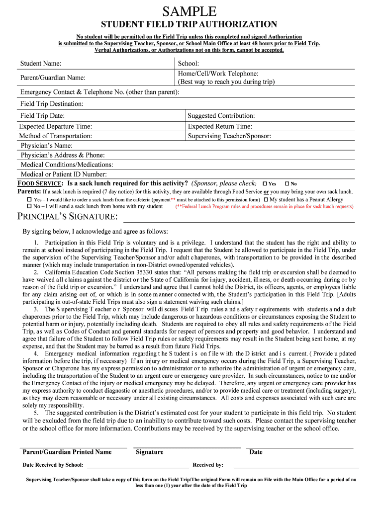 SAMPLE STUDENT FIELD TRIP AUTHORIZATION No student will be permitted on the Field Trip unless this completed and signed Authorization is submitted to the Supervising Teacher, Sponsor, or School Main