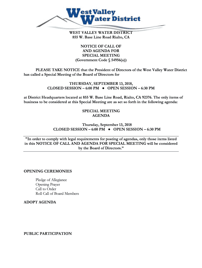 WEST VALLEY WATER DISTRICT 855 W. baseline Road Rialto, CA NOTICE OF CALL OF AND AGENDA FOR SPECIAL MEETING (Government Code 54956(a)) PLEASE TAKE NOTICE that the President of Directors of the West
