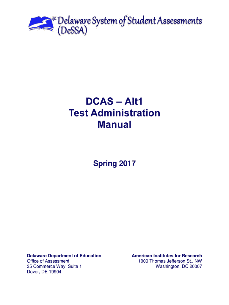 DIAS Alt1 Test Administration ManualSpring 2017Delaware Department of Education Office of Assessment 35 Commerce Way, Suite 1 Dover, DE 19904 Document Control No. 2011/08/04 ALT (Supersedes 2011/03/02