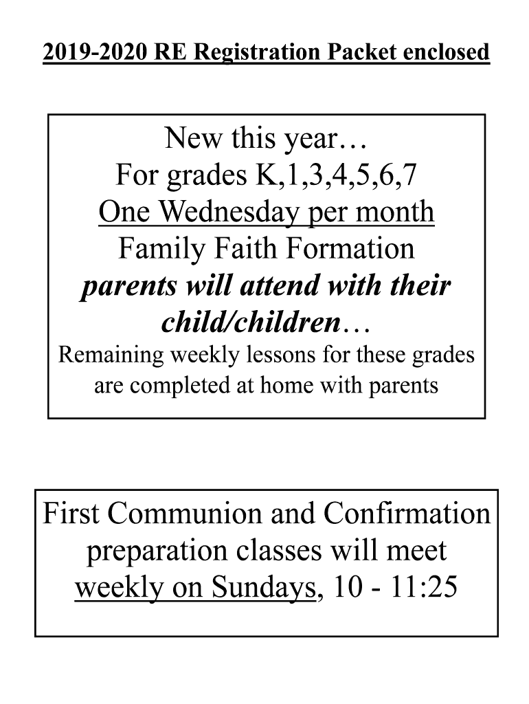 20192020 RE Registration Packets enclosed this year For grades K,1,3,4,5,6,7 One Wednesday per month Family Faith Formation parents will attend with their child/children Remaining weekly lessons for
