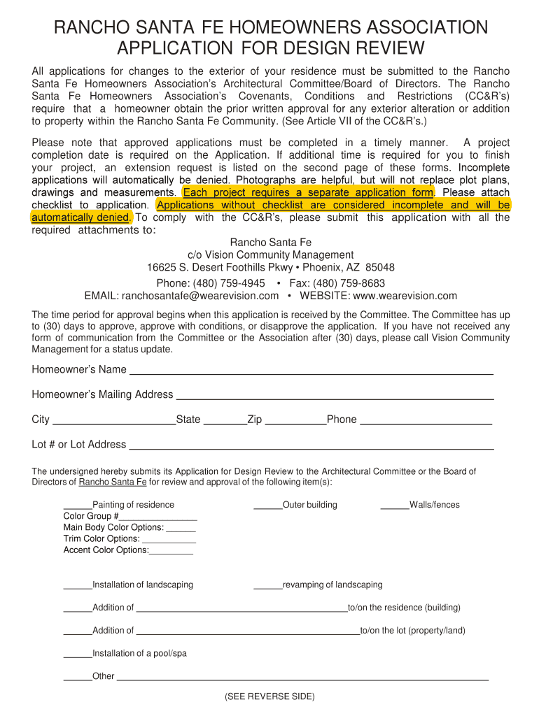 RANCHO SANTA FE HOMEOWNERS ASSOCIATION APPLICATION FOR DESIGN REVIEW All applications for changes to the exterior of your residence must be submitted to the Rancho Santa Fe Homeowners Associations