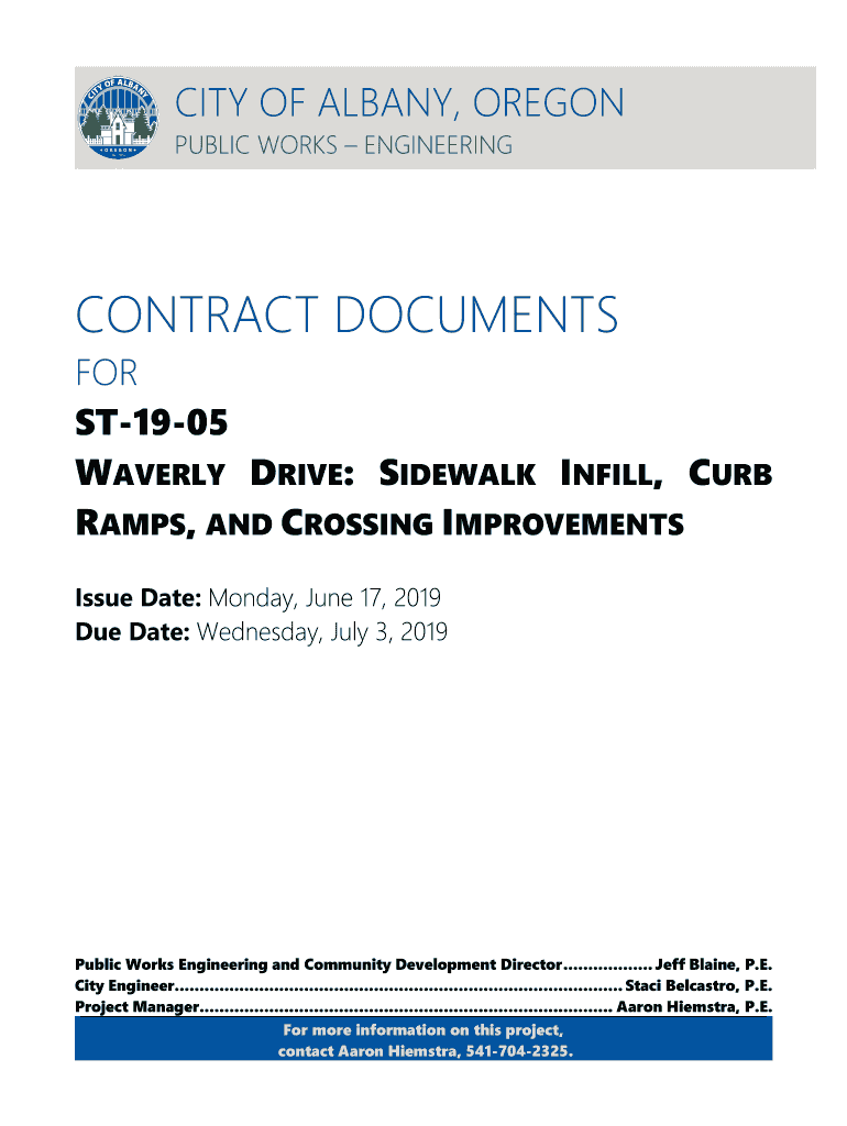 CITY OF ALBANY, OREGON PUBLIC WORKS ENGINEERINGCONTRACT DOCUMENTS FOR ST1905 WAVER LY DRIVE: SIDEWALK INFILL, CURB RAMPS, AND CROSSING IMPROVEMENTS Issue Date: Monday, June 17, 2019, Due Date: Wednesday,