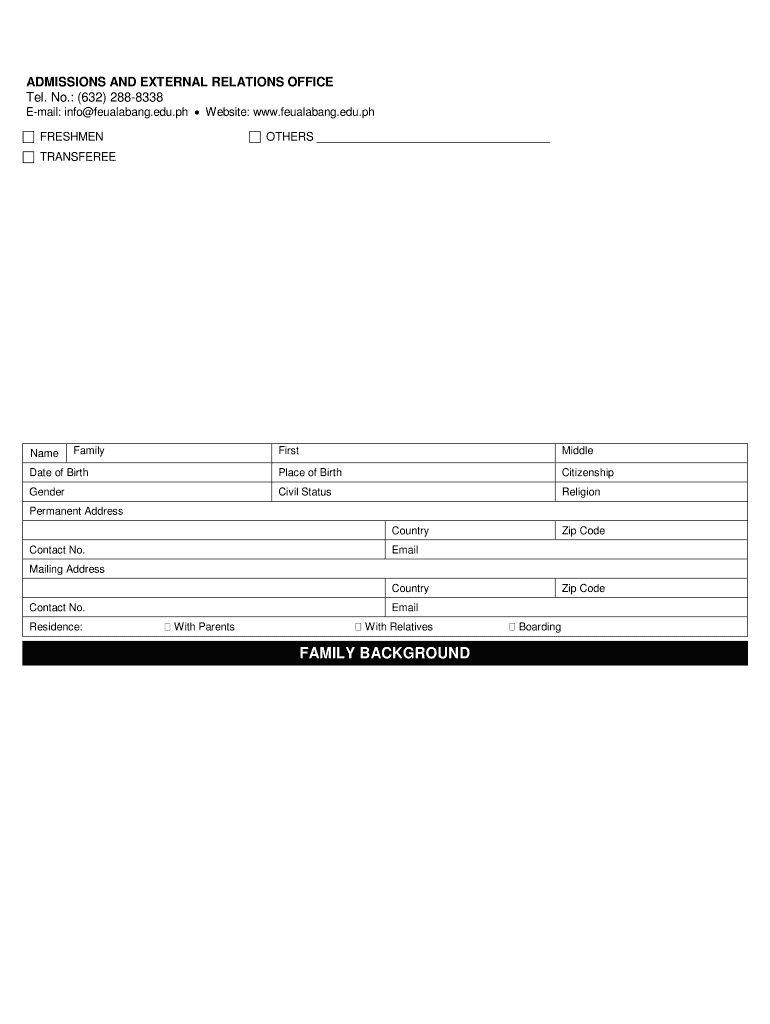 APPLICATION READMISSIONS AND EXTERNAL RELATIONS OFFICE Tel. No.: (632) 2888338Email: info feualabang.edu.pH Website: www.feualabang.edu.ph FRESHMEN OTHERS TRANSFEREEAttach two colored pictures release
