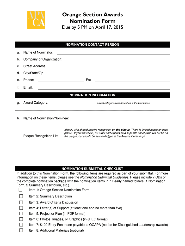 Orange section awards nominations can be filled out by completing a form or online submission with details about the nominee's accomplishments, contributions, and impact.