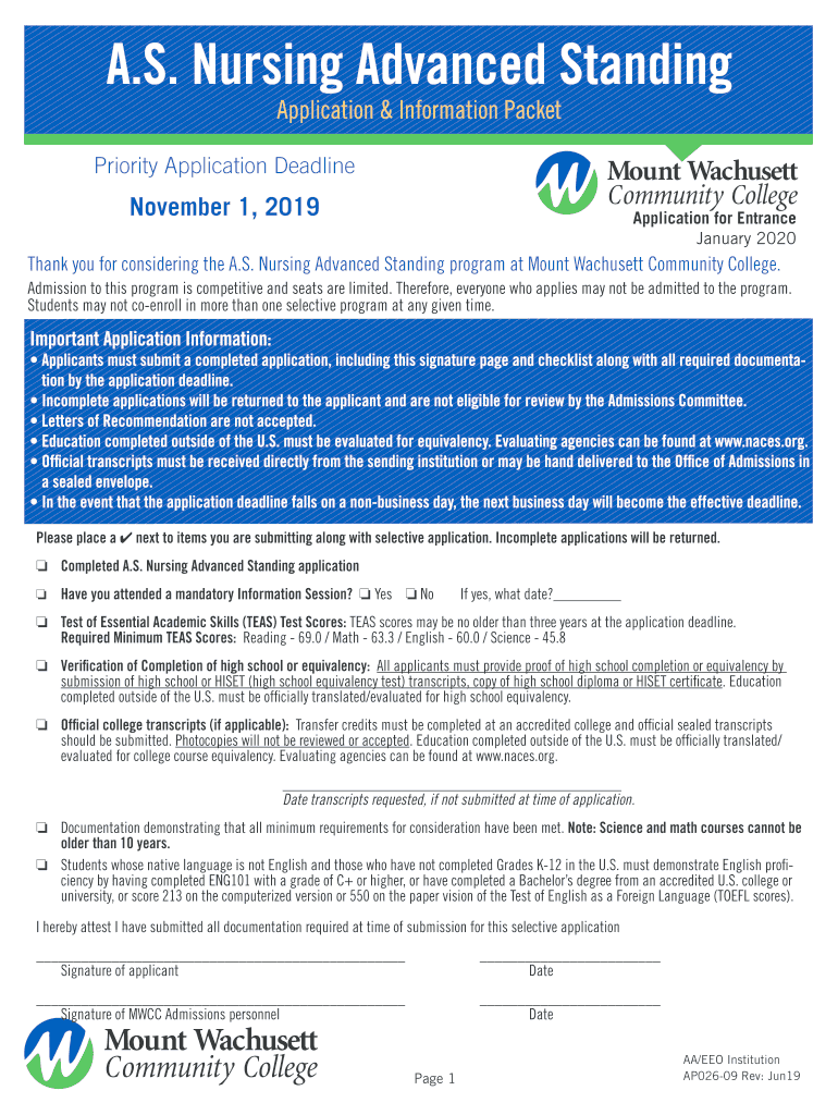 A.S. Nursing Advanced Standing Application & Information PacketPriority Application Deadline November 1, 2019Application for Entrance January 2020Thank you for considering the A.S. Nursing Advanced