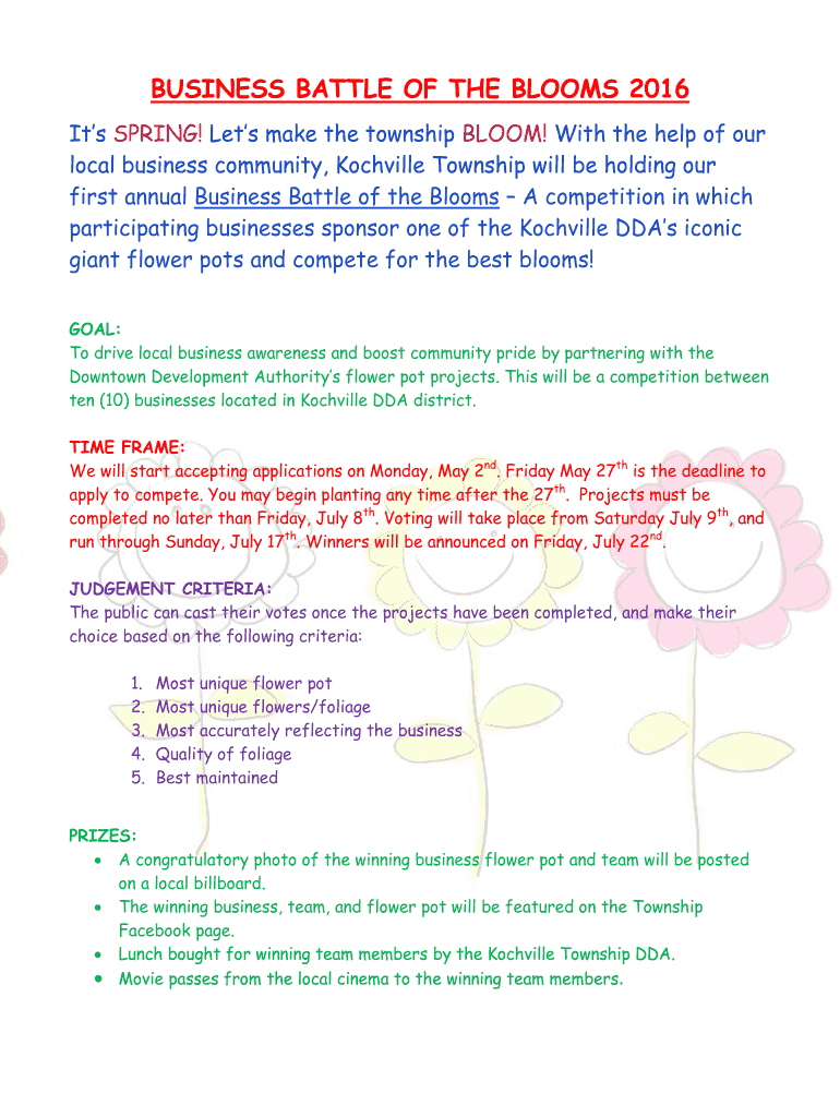BUSINESS BATTLE OF THE BLOOMS 2016 Its SPRING! Let's make the township BLOOM! With the help of our local business community, Rockville Township will be holding our first annual Business Battle of