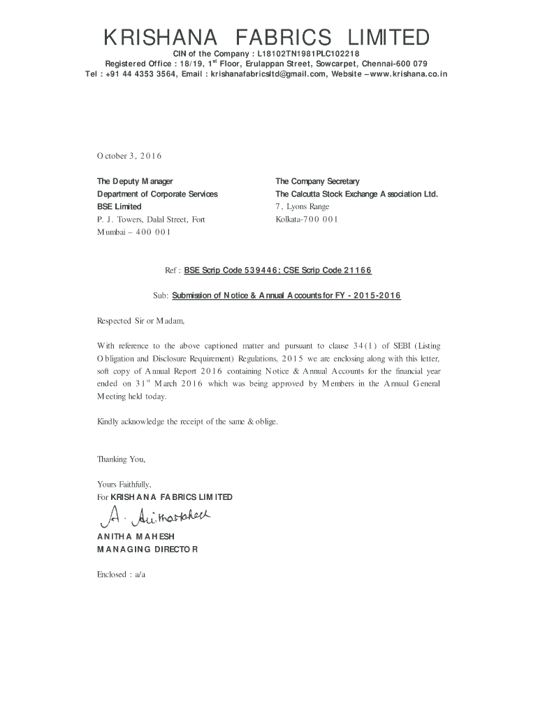 KRISHNA FABRICS LIMITED IN of the Company : L18102TN1981PLC102218 Registered Office : 18/19, 1st Floor, Uruapan Street, Sow carpet, Chennai600 079 Tells : +91 44 4353 3564, Email : krishanafabricsltd
